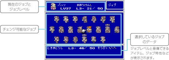 ゲームを進めると、主人公たちはさまざまなジョブ(職業)につくことができるようになり、ジョブを変えることで能力や特殊コマンドなどが変わります。選べるジョブは、ゲームを進めると増えていきます。 |