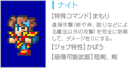 ![]() HPが減ってしゃがんでしまった味方のキャラクターが、敵の直接攻撃を受けたときに盾となってかばう。防御力の高い防具と、攻撃力のあるナイト専用の騎士剣を装備でき、攻守ともにバランスのとれた頼もしいジョブ。 |