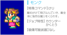 ![]() 素手による攻撃が得意な格闘家。武器は装備できないが、素手による攻撃は抜群の破壊力。そのうえ、敵から直接攻撃を受けると、一定の確率で反撃する。体力もあり、HPも高い。 |