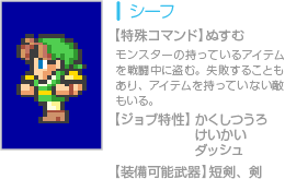 ![]() 素早さがウリの盗賊。ダンジョンや城などの隠された通路が見え、戦闘時にバックアタックを受けない。また、 |