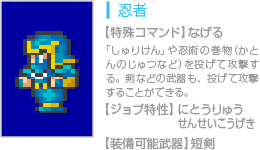 ![]() 両手に武器を装備できる、素早いファイター。戦闘に入ったとき、「先制攻撃」になる回数が増える。また、「かとんのじゅつ(火炎で焼きつくす)」「らいじんのじゅつ(雷で攻撃)」「すいとんのじゅつ(敵全体を水攻め)」といった忍術も強力。 |