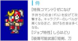 ![]() 切れ味抜群の刀を装備することができる、異国の武士。一定の確率で直接攻撃(剣や斧、殴りなどによる魔法以外の攻撃)を手で受け止めて、ダメージを受けない。 |