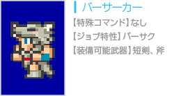 ![]() 戦闘中、敵が全滅するまでこちらの命令を一切聞かず、ひたすら闘い続ける闘士。重くて破壊力抜群の斧を装備することができる。 |