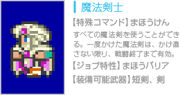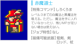 ![]() ある程度の強さの武器・防具を身につけることができ、魔法も回復系の白魔法と、攻撃系の黒魔法を唱えられるという、バランスのとれたジョブ。ただし、重い防具はつけられず、魔法もレベル3までのものに限られる。 |