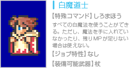 ![]() おもに回復や攻撃を助ける「白魔法」を唱える魔法使い。力も弱く、装備できる防具も限られているため、攻撃には向かないが、仲間に1人はほしいジョブ。特にダンジョンの奥深くに入っていったり、ボスクラスの敵と戦うときは、回復役として欠かせない。 |