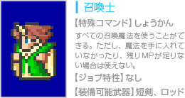 ![]() 幻界から幻獣を呼び出す「召喚魔法」を唱える魔法使い。並みのモンスターであれば一掃できるほどの強力な魔法を呼び出すため、最大MPも高い。召喚する幻獣は買えるものもあるが、その多くは世界のどこかに眠っているといわれる。 |