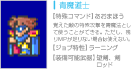 ![]() モンスターから特殊攻撃(きゅうけつ、ゴブリンパンチなど)を受けると、それを覚えることができ、次の戦闘から覚えた敵の攻撃を「青魔法」として唱えることができる。武器・防具もある程度の強さのものを装備できる。 |