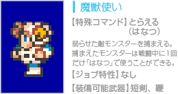 ![]() 敵モンスターを手玉にとる調教師。弱らせたモンスターを捕まえたり、装備した鞭で敵を麻痺させたりする。また、ジョブレベルアップで覚える「あやつる」で敵を操ることができる。 |