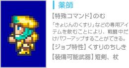 ![]() ポーションやめぐすりなどの回復用アイテムの専門家。このジョブが回復用アイテムを使うと、効果が2倍になる。また、ジョブレベルアップすると覚える「ちょうごう」で2つの薬を調合し、新しい薬を作り出すこともできる。 |