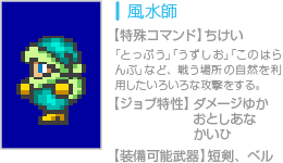 ジョブによって、戦闘で使える「特殊コマンド」、ジョブごとの特殊な能力「ジョブ特性」、「装備可能武器」が異なります。 |