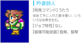 ![]() 不思議な力を持つ歌を歌う詩人。装備した「竪琴」を奏で、その音色で敵にいろいろな攻撃をする。歌は世界各地を放浪している詩人たちから手に入れることが多いので、探してみよう。 |