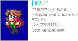 ![]() 装備も限られ、特殊な攻撃方法も「おどる」のみ。しかし魔法攻撃に対して絶大な防御をほこる「リボン」を装備できるのは「踊り子」と「すっぴん」だけ。踊り子だけのパーティを組めば、つらい冒険も楽しくにぎやかになりそう(?)。 |