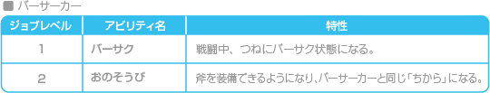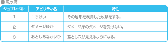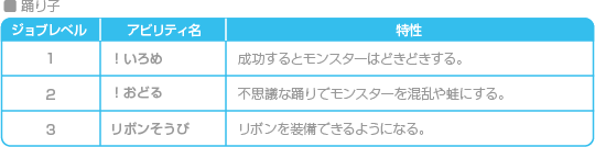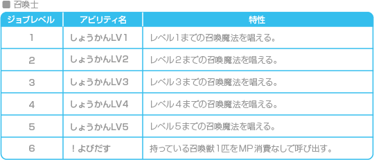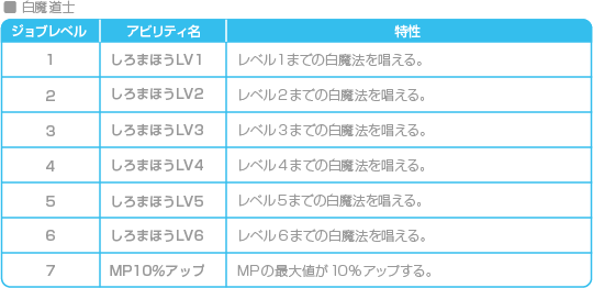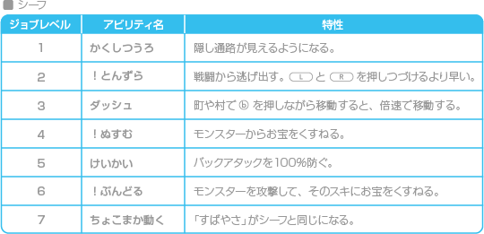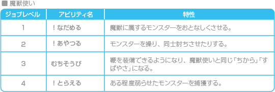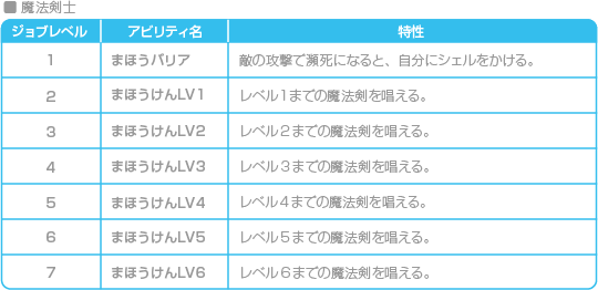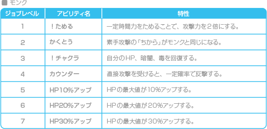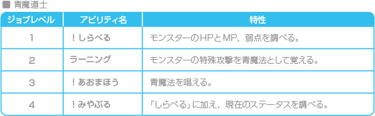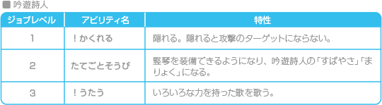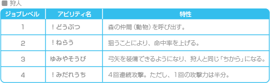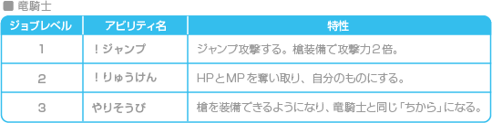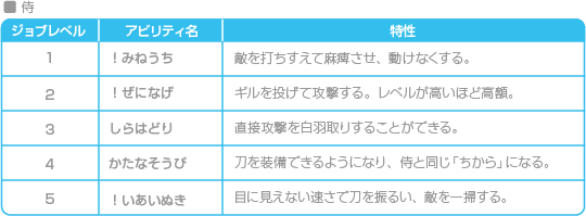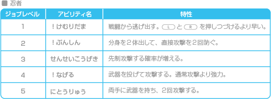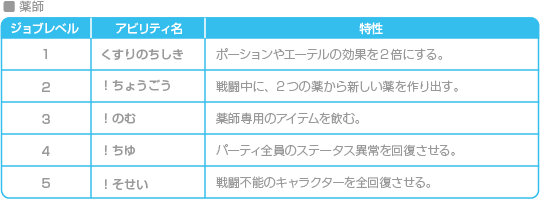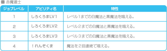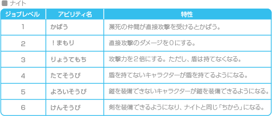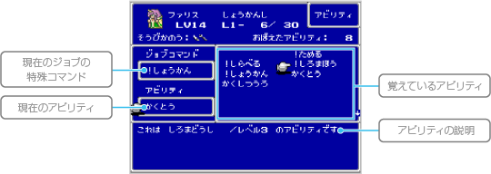 アビリティは、ジョブごとの特殊能力です。現在のジョブのジョブレベルが上がると、新しいアビリティを覚えることができます。一度覚えたアビリティは、ほかのジョブでも1つだけ使用できます(ジョブが「すっぴん」のときは2つ使用できます)。 |