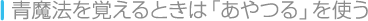 | 青魔法は「青魔道士」かアビリティ「ラーニング」をつけているキャラクターが、敵の特定の攻撃を受けることで覚えることができます。青魔法を覚えるには敵がその攻撃を使ってくるのを待つ必要がありますが、敵によってはなかなか使わないものもいます。そのような敵にはアビリティの「あやつる」を使って、敵の行動を決めることがオススメです。 | ![]() |