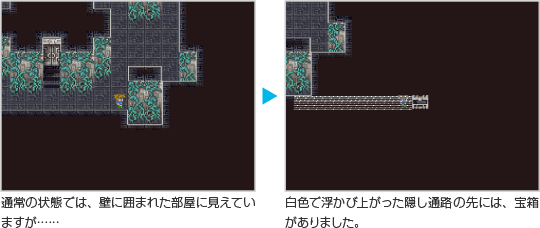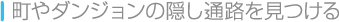 町やダンジョンには通常では見えない隠し通路があり、その先で貴重なアイテムが手に入る場合があります。隠し通路は、「シーフ」やアビリティ「かくしつうろ」をつけたキャラクターがいると、見えるようになります。 ![]() |