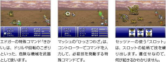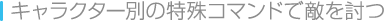 このゲームでは、キャラクターごとに特殊なコマンドを使うことができます。コマンドごとに特徴が異なるため、戦う敵に合わせて使い分けることが重要です。 ![]() |