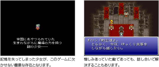 | 「ファイナルファンタジーVI」は1994年4月2日にスーパーファミコンで発売されたロールプレイングゲームです。魔法という1000年前の文明と、人類が築き上げた機械文明。その2つを融合させ、新たな力によって世界征服を企む悪に、勇敢に立ち向かうキャラクターたちを描いたゲームです。 | ![]() |