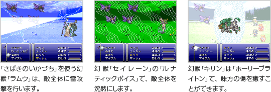 このゲームの世界には、強大な力を秘めた「幻獣」が存在していて、キャラクターはその力を得ることができます。幻獣は、戦闘に参加してキャラクターを助けてくれたり、キャラクターが魔法を修得する手助けをしてくれたりします。 ![]() |