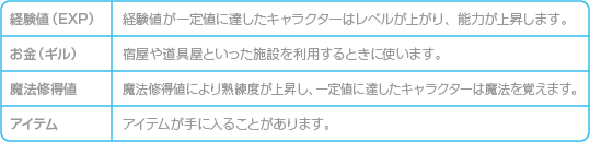 主人公たちは戦闘に勝つと、経験値(EXP)やお金(ギル)、アイテムを手に入れます。また、ゲームを進めて、アイテム「魔石」を手に入れると、魔法修得値も獲得できるようになります。