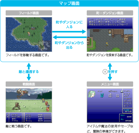 2種類のマップ画面で冒険し、「戦闘画面」で敵と戦ってゲームを進めます。「メニュー画面」を表示すると、さまざまな情報を確認できます。