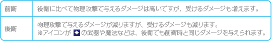 キャラクターの位置には前衛と後衛があり、それぞれ以下の特徴があります。前衛と後衛を変える場合は、メニュー画面で |