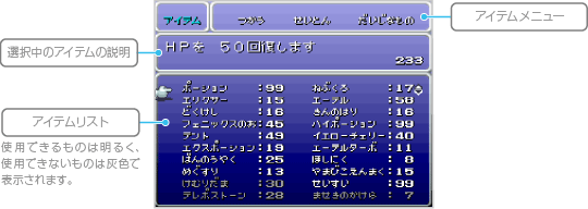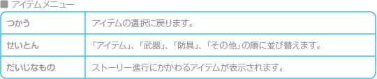 持っているアイテムを使うことができます。使いたいアイテムを ![]() ![]() |