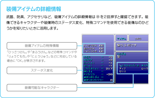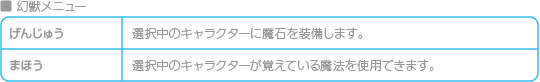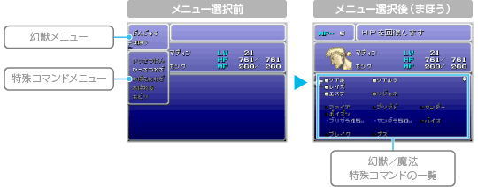 魔法を覚えるために必要なアイテム「魔石」を装備したり、MPを消費して魔法を使うことができます。また、キャラクター別の特殊コマンドを見ることができます。