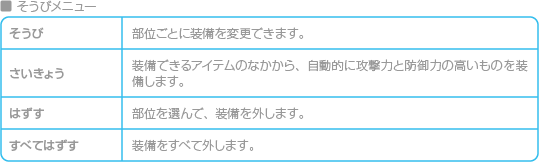 キャラクターの装備する武器や防具を変更できます。アイテムを装備できる部位は「みぎて」「ひだりて」「あたま」「からだ」の4カ所です。装備を変更したいキャラクターを選んだら、そうびメニューを選んで装備を変更してください。