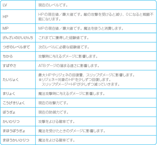 各キャラクターの現在の能力や状態を見ることができます。ステータスを見たいキャラクターを選択してください。