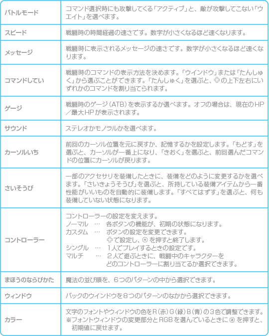 ゲームのシステムを、自分の好みに応じて変更できるコマンドです。 ![]() |