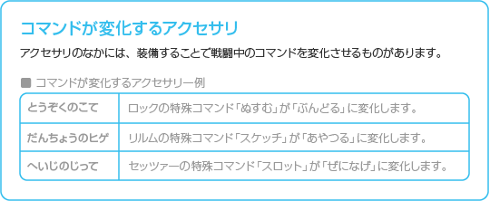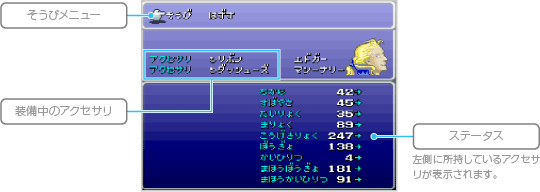 キャラクターの装備するアクセサリを変更できます。装備できるアクセサリの数は2つです。装備を変更したいキャラクターを選んだら、そうびメニューを選んでアクセサリを変更してください。