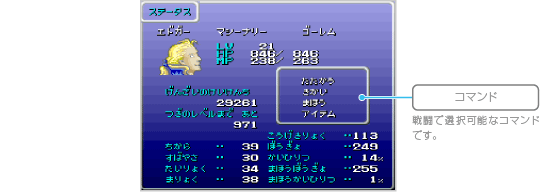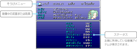 メニュー画面では、コマンドを選んでキャラクターの状態を確認したり、アイテムや魔法を使うことができます。 |