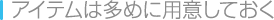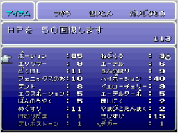 | アイテムは、登場人物全員の共有財産です。ときには、いくつかのパーティに別れて行動したり、体力を回復する魔法やコマンドを使えるキャラクターがいないパーティで行動しなければならない場合があります。アイテムは、ほかのパーティの分まで考えて、多めに用意しておくことが大切です。 | ![]() |