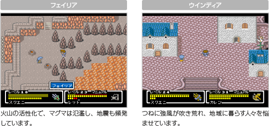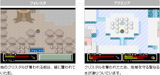 世界には「フォレスタ」や「アクエリア」など、4つの町があります。それぞれの町にはクリスタルが祭られていましたが、クリスタルは奪われ、災害が起こっています。主人公たちは災害を止めるため、クリスタルを取り戻すことになるのです。 ![]() ![]() |