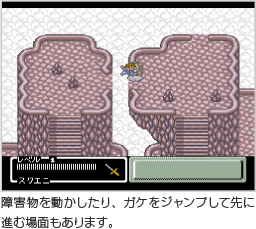 | ダンジョンでは、装備を使って進む場面があります。剣で仕掛けのスイッチを作動させたり、爆弾で壁を壊して隠し通路を見つけたりして先へと進むのです。 | ![]() |