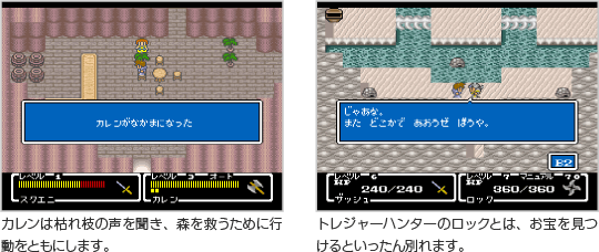 主人公とともに戦うことになる仲間は、木と話のできる少女「カレン」やお宝を探して旅する「ロック」などの4人です。主人公は彼らとの出会いと別れを繰り返し、4 人のうち1人とともに旅をしていきます。 ![]() |