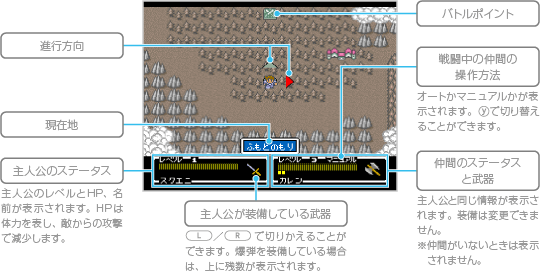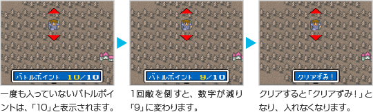 バトルポイントはフィールド上で敵と戦うための場所で、入ると敵と戦うことができます。全部で10回戦うことができ、1回の戦闘が終わるたびにフィールド画面に戻ります。最後まで倒すと、経験値やお金、アイテムなどがもらえます。途中で負けると、通常の戦闘と同様に全滅となります。 ![]() |