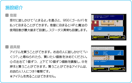 町には人々が暮らしていて、話すことで情報を得ることができます。また、ダンジョンでは敵が出現します。さまざまなアクションを使って、冒険を進めてください。 |