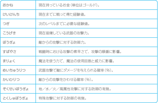 主人公と仲間の状態を見ることができます。主人公の状態は左に、仲間の状態は右に表示されます。 |