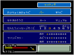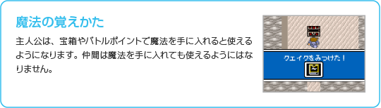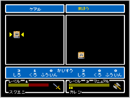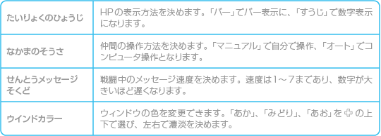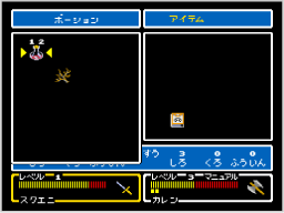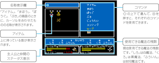 「アイテム」「まほう」「ぼうぐ」「ぶき」「じょうたい」「コンフィグ」「セーブ」という7つのコマンドがあります。 |