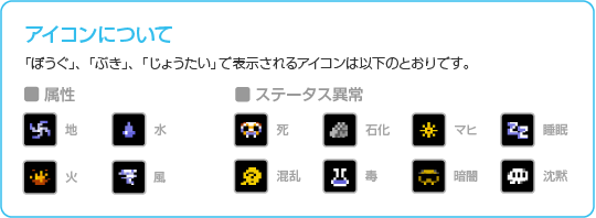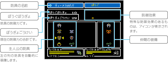 持っている防具を見ることができます。主人公は、持っている防具のなかから一番強いものを自動的に装備します。 ![]() |