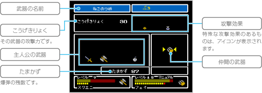 持っている武器を見ることができます。武器には、剣、オノ、爪、爆弾の4系統があり、系統ごとに一番強いものが自動的に装備されます。装備する武器の系統を変えたい場合は、 ![]() |