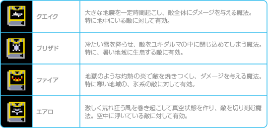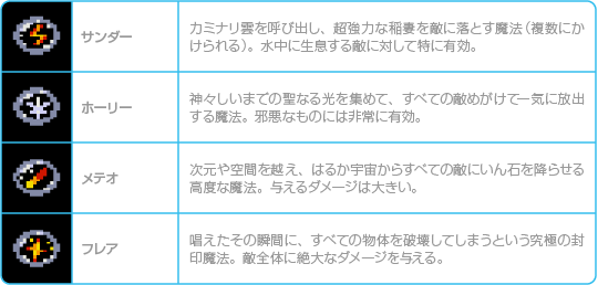 地、水、火、風の4大元素を司る攻撃魔法です。