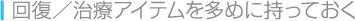 HPが大きく減っていたり、ステータス異常のまま戦闘に突入すると戦闘が不利になります。あらかじめ回復しておき、万全の状態で戦いを挑むのがオススメです。 |