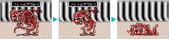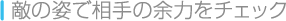 敵は、ダメージを受けると姿が変化します。戦闘態勢の敵が手負いの姿に変化した場合、その敵の残りHPが少ないという合図です。相手の姿を大まかな目安にして、仲間の回復を優先する、一気にトドメをさすなど、戦いかたを考えてみてください。 ![]() |