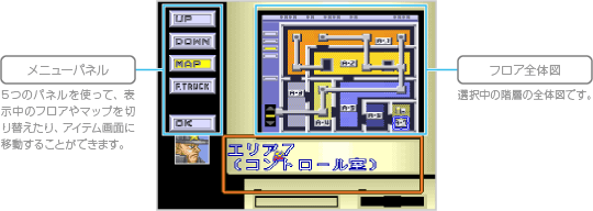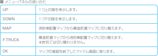 マップ画面には、「構造把握マップ」と「消防車配置マップ」の2つがあります。「OK」を選ぶと、アイテム画面に進みます。 |