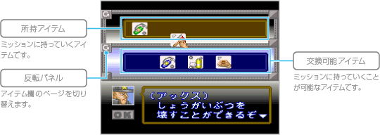 「選択画面」でミッションに持っていくアイテム(アイテムパネル)を選び、「準備画面」でアイテムを装備します。アイテムパネルを移動させるときは、移動させたいパネルを |