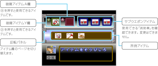 持っていくアイテムを交換可能アイテムから選びます。一定数以上のアイテムを持つと、ダッシュやキックができなったり、移動速度が低下したり、ジャンプができなくなります。「OK」を選ぶと「確認画面」に進みます。 ![]() |
