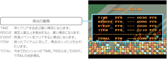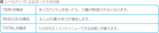 ミッションをクリアすると、救出中の行動に応じて4つの得点を獲得できます。なお、「TIME」「RESCUE」「TOTAL」の得点は、一定値に達すると主人公がレベルアップしてボーナスを得ることができます。 ![]() ![]() |
