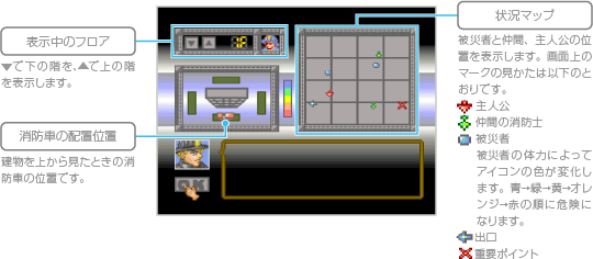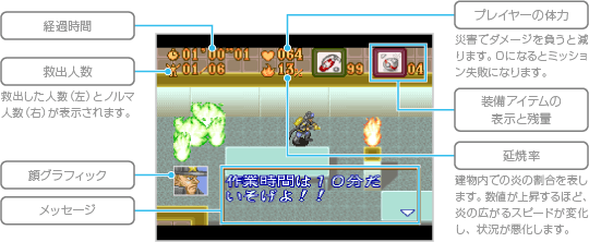 「経過時間」や「延焼率」に注意しながら、主人公を操作して被災者を捜索します。規定人数以上を救出し、キャプテンに話しかけるとミッションをクリアできます。 ![]() |